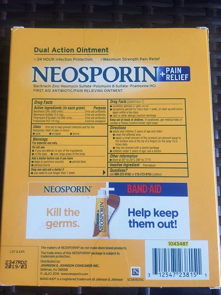 SIMPLY NEOSPORIN™ – Three Ingredient Antibiotic Ointment (Xanh Lá nhạt): là loại mỡ bôi kháng sinh giúp ngăn ngừa nhiễm trùng mạnh mẽ mà không gây châm chích cho vết cắt nhỏ, vết trầy xước, vết thương và vết bỏng. Có 3 thành phần: Bacitracin Zinc, Polymyxin B Sulfate và Petrolatum.